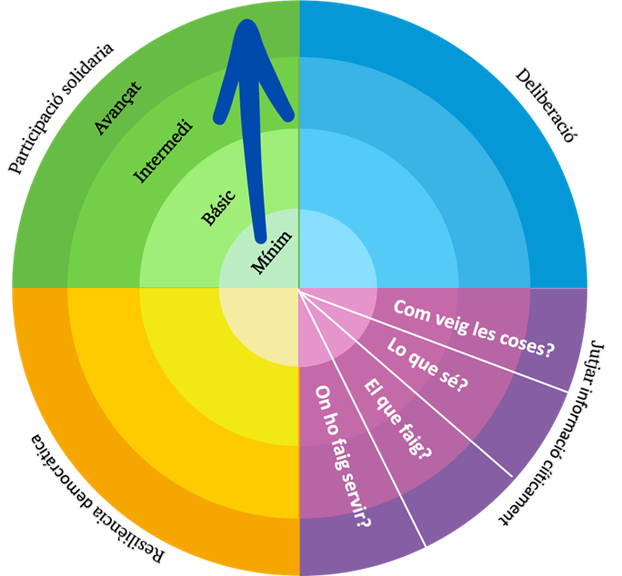 Els objectius del taller eren, d’una banda, presentar les eines per a avaluar l’acompliment de l’alumnat en 4 àrees clau de competències de Ciutadania Democràtica Responsable, descrites en el projecte DEMOCRAT: participació solidària, deliberació, judici i pensament crític i resiliència democràtica (Gràfic 1). I, especialment, fomentar el debat entre els i les participants i intercanviar opinions sobre les eines presentades